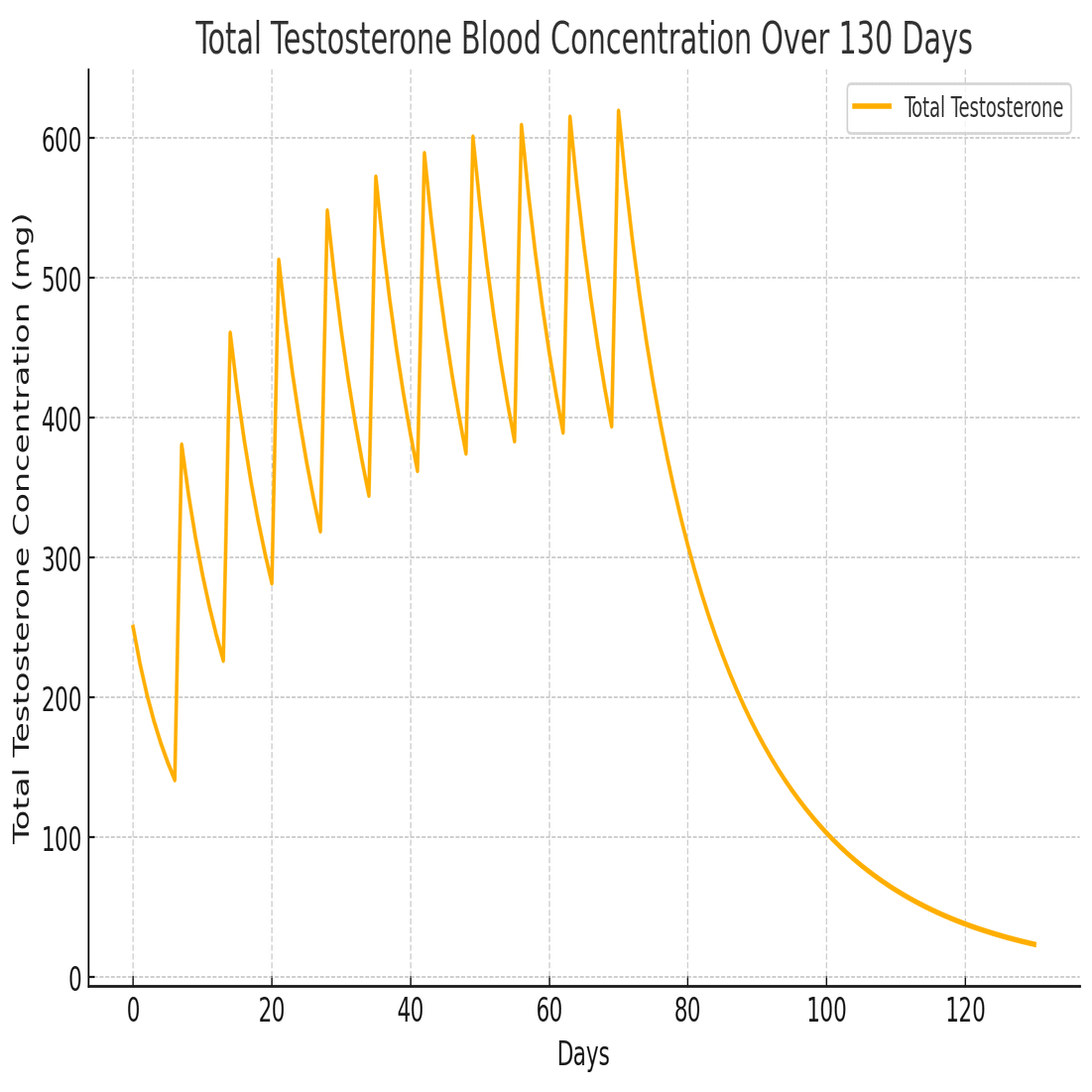 このグラフは、7日に1回250mgのサスタノンを投与したとき、体内の血中濃度がどうなるかを表したものです。サスタノンは複数のエステルが混合されているので、各エステルの半減期を考慮して、トータルのテストステロンがどの程度体に残っているかを表しています。