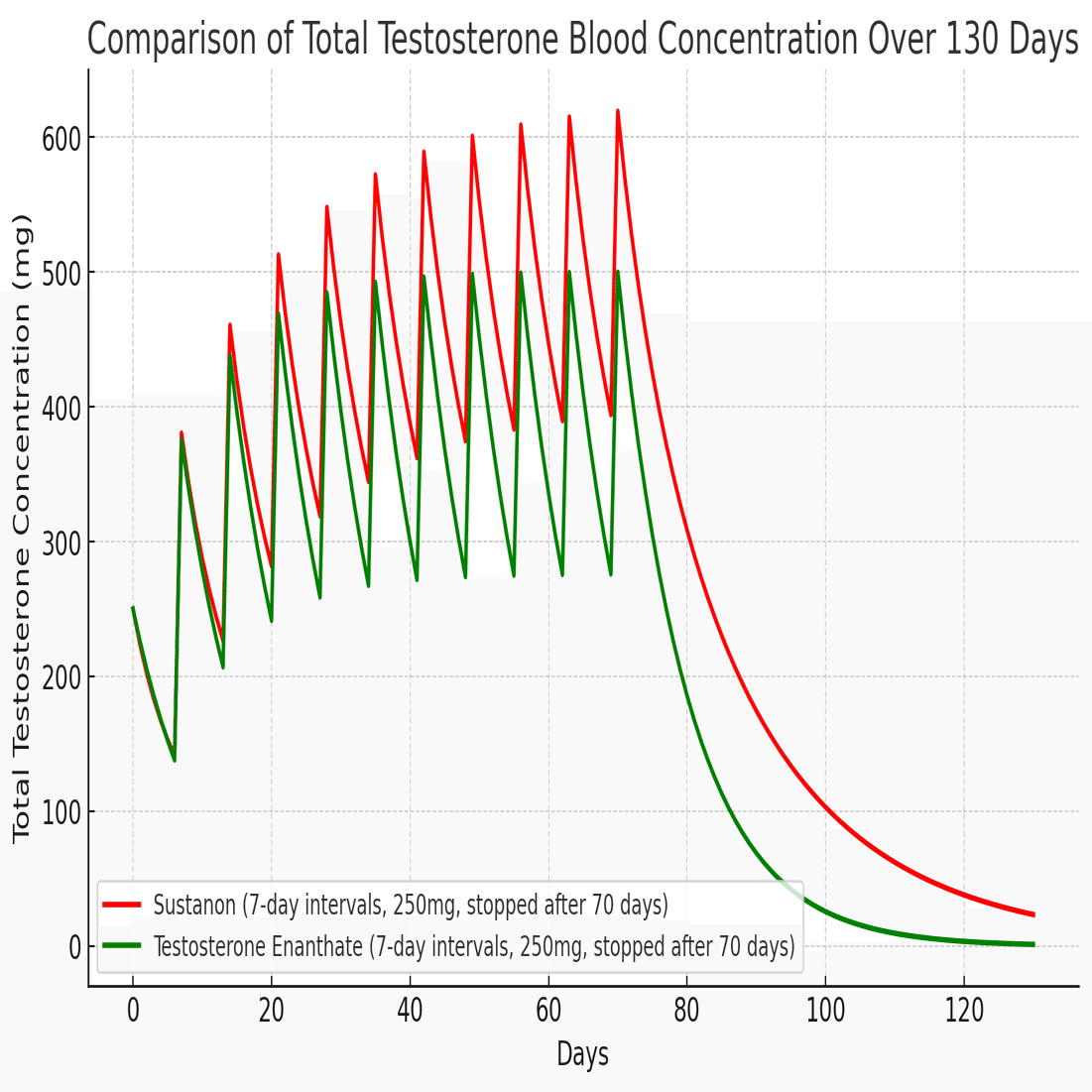 グラフの後半は、70日目の11回目を最後に投与をやめた場合、血中濃度の変化をグラフで表したものです。100日後でも100mg残っており、ほぼ抜けるまでに120日ほど掛かりそうです。サスタノンがコンテストに向かない理由はこのためです。